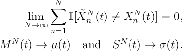 ![\begin{aligned} \lim_{N\rightarrow\infty} \sum_{n=1}^N {\mathbb I} [ \tilde{X}^N_n(t) \neq X^N_n(t) ] =0,\label{MF:Xdiff}\\ M^N(t) \rightarrow \mu(t) \quad\text{and}\quad S^N(t) \rightarrow \sigma(t).\end{aligned}](https://appliedprobability.blog/wp-content/uploads/2017/07/bb7b9fa0801df4aed9ed0b14eb081275.png?w=840)