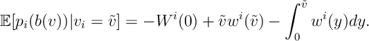 ![\label{RE:payoff} {\mathbb E}[p_i(b(v)) | v_i=\tilde{v}]= -W^i(0) + \tilde{v} w^i(\tilde{v}) - \int_0^{\tilde{v}} w^i(y)dy.](https://appliedprobability.blog/wp-content/uploads/2017/07/d4faaca00312d2bb1939af1bb545c569.png?w=840)