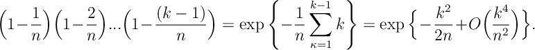 ![\begin{aligned} {\mathbb P} ( Y^n = k ) & = { n \choose k } \left( \frac{\lambda}{n} \right)^k \left( 1- \frac{\lambda}{n} \right)^{n-k} \\ & = \left[ \frac{n}{n} \cdot \frac{n-1}{n} \cdot ... \cdot \frac{n-k+1}{n} \cdot \left( 1-\frac{\lambda}{n} \right)^{-k} \right] \left( 1-\frac{\lambda}{n} \right)^n \frac{\lambda^k}{k!} \\ & \xrightarrow[n\rightarrow\infty]{} e^{-\lambda} \frac{\lambda^k}{k!}\end{aligned}](https://appliedprobability.blog/wp-content/uploads/2017/07/7bfa3988cd08e2534fbd3a45c4170196.png?w=840)