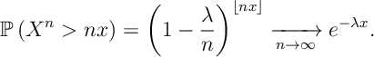 ![{\mathbb P} \left( X^n > nx \right) = \left( 1- \frac{\lambda}{n} \right)^{\lfloor nx\rfloor } \xrightarrow[n\rightarrow\infty]{} e^{-\lambda x}.](https://appliedprobability.blog/wp-content/uploads/2017/07/da63272d63d22e8c2c513b48b3d1ed83.png?w=840)