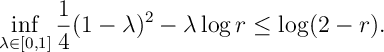 ![\inf_{\lambda\in[0,1]} \frac{1}{4}(1-\lambda)^2 -\lambda \log r \leq \log (2-r).](https://appliedprobability.blog/wp-content/uploads/2017/09/1e35d1264b7b8b596fcbecca4704a095.png?w=840)