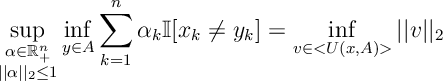 ![\begin{aligned} \sup_{\substack{\alpha\in\bR_+^n\\ ||\alpha||_2\leq 1}} \inf_{y\in A} \sum_{k=1}^n \alpha_k \bI[x_k\neq y_k]= \inf_{v\in < U(x,A)>} ||v||_2 \end{aligned}](https://appliedprobability.blog/wp-content/uploads/2017/09/adb9ff9e2fe92a73cbe23418872755d9.png?w=840)