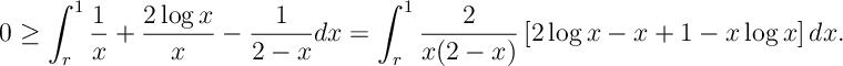 ![0\geq \int^1_r \frac{1}{x} +\frac{2\log x}{x} -\frac{1}{2-x} dx = \int_r^1 \frac{2}{x(2-x)}\left[ 2 \log x - x+1 - x\log x \right]dx.](https://appliedprobability.blog/wp-content/uploads/2017/09/f7dec8adef91c26f4c2d95502ee033d1.png?w=840)