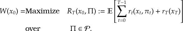 ![\begin{aligned} W(x_0) =& \text{Maximize} \quad R_T(x_0,\Pi):= \mathbb{E} \left[ \sum_{t=0}^{T-1} r_t(x_t,\pi_t) + r_T(x_T)\right]\\ &\text{over} \qquad\qquad \Pi \in \mathcal{P}.\notag \end{aligned}](https://appliedprobability.blog/wp-content/uploads/2017/04/d09aca4f94bf7fdb098f06fcdf9f65ab.png?w=840)