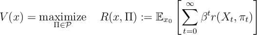![V(x) = \maxi_{\Pi \in {\mathcal P} } \quad R(x,\Pi) := \mathbb{E}_{x_0} \left[ \sum_{t=0}^{\infty} \beta^{t} r(X_t,\pi_t) \right]](https://appliedprobability.blog/wp-content/uploads/2018/02/3594a6e0fbb20e7a32ced216da73392e.png?w=840)