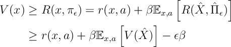 ![\begin{aligned} V(x) & \geq R(x,\pi_\epsilon) = r(x,a) + \beta \mathbb{E}_{x,a} \left[ R(\hat{X},\hat{\Pi}_\epsilon) \right] \\ & \geq r(x,a) + \beta \mathbb{E}_{x,a} \left[ V(\hat{X}) \right] - \epsilon \beta\end{aligned}](https://appliedprobability.blog/wp-content/uploads/2018/02/408cbd8586c6d8a219023f1370b25c9f.png?w=840)