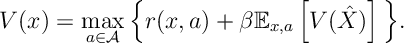 ![V(x) = \max_{a\in {\mathcal A}} \Big\{ r(x,a) + \beta {\mathbb E}_{x,a} \left[ V(\hat{X}) \right] \Big\}.](https://appliedprobability.blog/wp-content/uploads/2018/02/59eb3d8eddf1452495e360435d2c24fc.png?w=840)
