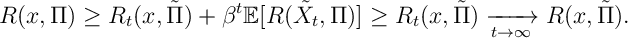 ![R(x,\Pi) \geq R_t(x,\tilde \Pi ) + \beta^t \mathbb E [ R(\tilde{X}_t,\Pi ) ] \geq R_t(x,\tilde{\Pi}) \xrightarrow[t\rightarrow \infty]{} R(x,\tilde \Pi ).](https://appliedprobability.blog/wp-content/uploads/2018/02/5de81f06d97d64402c295b0b55e82170.png?w=840)