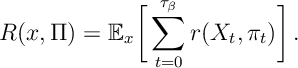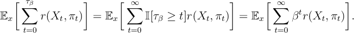 ![\mathbb E_{x} \bigg[ \sum_{t=0}^{\tau_\beta } r(X_t,\pi_t)\bigg] = \mathbb E_{x} \bigg[ \sum_{t=0}^{\infty } \mathbb I [\tau_\beta \geq t] r(X_t,\pi_t)\bigg] = \mathbb E_{x} \bigg[ \sum_{t=0}^\infty \beta^t r(X_t,\pi_t) \bigg].](https://appliedprobability.blog/wp-content/uploads/2018/02/e185e4a9ab59ea4d23fb246eb29c1c73.png?w=840)