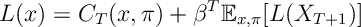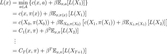 ![\begin{aligned} L(x) & = \min_{a\in \mathcal A} \left\{ c(x,a) + \beta \mathbb E_{x,a} [ L(X_1) ] \right\} \\ & = c(x,\pi(x)) + \beta \mathbb E_{x,\pi(x)} \left[ L(X_1) \right]\\ & = c(X_0,\pi(X_0)) + \beta \mathbb E_{X_0,\pi(X_0)} \left[ c(X_1,\pi(X_1)) + \beta \mathbb E_{X_1,\pi(X_1)} \left[ L(X_2) \right] \right]\\ & =C_1(x,\pi) +\beta^2 \mathbb E_{x,\pi} [L(X_2)] \\ & \;\;\vdots \\ & = C_T(x,\pi) +\beta^T \mathbb E_{x,\pi} [L(X_{T+1})] \end{aligned}](https://appliedprobability.blog/wp-content/uploads/2018/02/f875963e8f42a454615987f783b3d0a3.png?w=840)