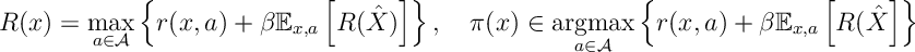 ![R(x) = \max_{a\in {\mathcal A} } \left\{ r(x,a) + \beta \mathbb{E}_{x,a} \left[ R(\hat{X}) \right] \right\}, \quad \pi(x) \in \argmax_{a\in \mathcal A} \left\{ r(x,a) + \beta \mathbb E_{x,a} \left[ R(\hat{X} \right] \right\}](https://appliedprobability.blog/wp-content/uploads/2018/02/74c26912393065a7d954166c0480270b.png?w=840)