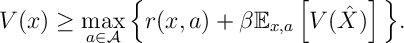 ![V(x) \geq \max_{a\in {\mathcal A}} \Big\{ r(x,a) + \beta {\mathbb E}_{x,a} \left[ V(\hat{X}) \right] \Big\}.](https://appliedprobability.blog/wp-content/uploads/2018/02/763b8252481ac8c7185b9b4f4a235d41.png?w=840)