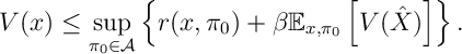 ![V(x) \leq \sup_{\pi_0 \in {\mathcal A}} \left\{ r(x,\pi_0) + \beta \mathbb{E}_{x,\pi_0} \left[ V(\hat{X}) \right] \right\}.](https://appliedprobability.blog/wp-content/uploads/2018/02/9613eff6520747960e79455a7537d4da.png?w=840)