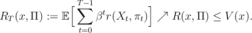 ![R_T(x,\Pi) := \mathbb{E} \Big[ \sum_{t=0}^{T -1} \beta^{t} r(X_t,\pi_t) \Big] \nearrow R(x,\Pi) \leq V(x).](https://appliedprobability.blog/wp-content/uploads/2018/02/a838a673c3f3412a2223fbe55066ff88.png?w=840)