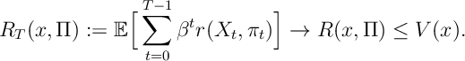![R_T(x,\Pi) := \mathbb{E} \Big[ \sum_{t=0}^{T -1} \beta^{t} r(X_t,\pi_t) \Big] \rightarrow R(x,\Pi) \leq V(x).](https://appliedprobability.blog/wp-content/uploads/2018/02/c0e91b45cfac243692a915a7fc247b2e.png?w=840)