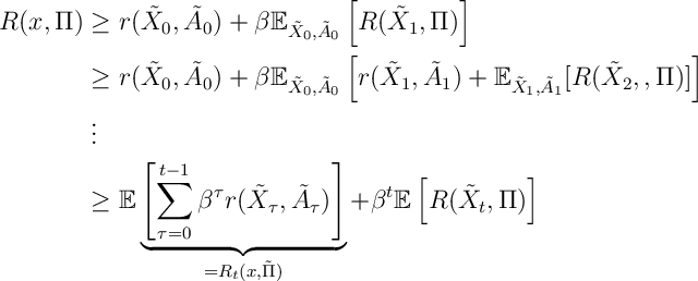 ![\begin{aligned} R(x,\Pi) & \geq r(\tilde{X}_0,\tilde A_0) + \beta \mathbb E_{\tilde{X}_0,\tilde A_0} \left[ R(\tilde X_1 , \Pi ) \right] \\ & \geq r(\tilde X_0,\tilde A_0) + \beta \mathbb E_{\tilde X_0,\tilde A_0} \left[ r(\tilde{X}_1,\tilde{A}_1) + \mathbb E_{\tilde X_1,\tilde A_1} [ R(\tilde{X}_2,,\Pi) ] \right] \\ &\; \vdots \\ &\geq \mathbb E \underbrace { \left[ \sum_{\tau=0}^{t-1} \beta^{\tau} r(\tilde{X}_{\tau},\tilde{A}_{\tau}) \right] }_{ = R_t(x,\tilde \Pi ) } + \beta^t \mathbb E \left[ R(\tilde{X}_t,\Pi) \right]\end{aligned}](https://appliedprobability.blog/wp-content/uploads/2018/02/d2f66dce80b9e017fabcd5c20e8001f7.png?w=840)