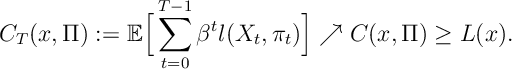 ![C_T(x,\Pi) := \mathbb{E} \Big[ \sum_{t=0}^{T -1} \beta^{t} l(X_t,\pi_t) \Big] \nearrow C(x,\Pi) \geq L(x).](https://appliedprobability.blog/wp-content/uploads/2018/02/e6234a759ff2bf3e4c91852bd92c61c6.png?w=840)