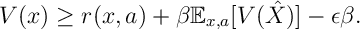 ![V(x) \geq r(x,a) + \beta \mathbb E_{x,a} [V(\hat{X})] - \epsilon \beta .](https://appliedprobability.blog/wp-content/uploads/2018/02/ed450b8f3ed7651c37d8facb30291f42.png?w=840)