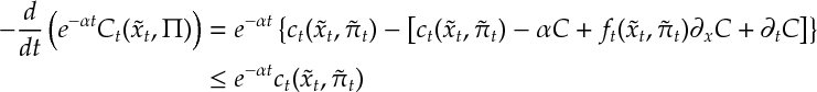 ![\begin{aligned} -\frac{d}{dt} \left(e^{-\alpha t} C_t(\tilde{x}_t,\Pi)\right)&=e^{-\alpha t} \left\{ c_t(\tilde{x}_t,\tilde{\pi}_t) - \left[ c_t(\tilde{x}_t,\tilde{\pi}_t) - \alpha C + f_t(\tilde{x}_t,\tilde{\pi}_t) \partial_x C + \partial_t C\right]\right\}\\ &\leq e^{-\alpha t} c_t(\tilde{x}_t,\tilde{\pi}_t) \end{aligned}](https://appliedprobability.blog/wp-content/uploads/2017/04/14ae2cec35d827c74ddad24bf8f4cff8.png?w=840)