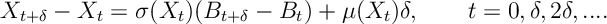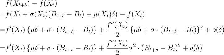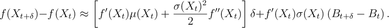 ![f(X_{t+\delta}) - f(X_t) \approx \left[f'(X_t)\mu(X_t) + \frac{\sigma(X_t)^2}{2}f''(X_t)\right] \delta + f'(X_t) \sigma(X_t) \left(B_{t+\delta}-B_t\right) .](https://appliedprobability.blog/wp-content/uploads/2018/02/e8c5a5d660bc57e737608b3ee6806e25.png?w=840)