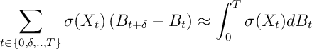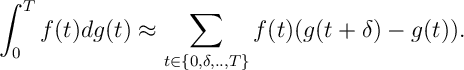 So one might expect a integral limit. (This is unrigorous because Riemann-Stieltjes Integration only applies to functions with finite variation – while Brownian motion does not have finite variation.)