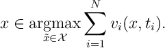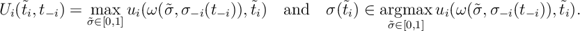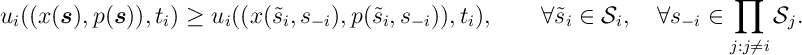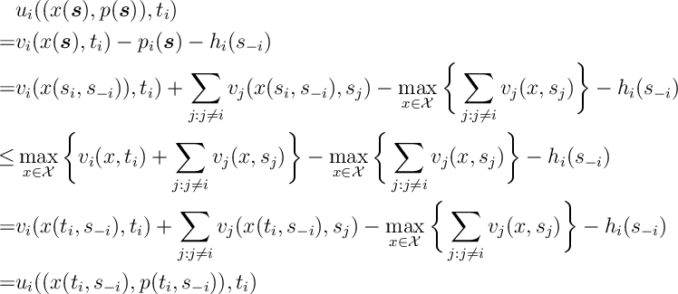 ![\label{VCG:Bayes-Nash} {\mathbb E}[ u_i(\omega(\sigma(\bm{t})),t_i)|t_i]\geq {\mathbb E}[ u_i(\omega(\tilde{\sigma}_i,\sigma_{-i}(\bm{t}_{-i})),t_i)|t_i],\qquad \forall \tilde{\sigma}_i\in {\mathcal S}_i.](https://appliedprobability.blog/wp-content/uploads/2018/07/690b5ea0986288770015a3646cb7882e.png?w=840)