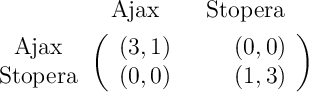 Ex. [Battle of the Sexes] Two students decide to go on a date. One wants to go see the Ajax play the other wants to see a show the National Ballet at the Stopera. If they can’t agree then the date will not happen. The rewards to this game are