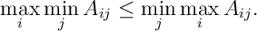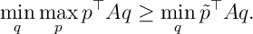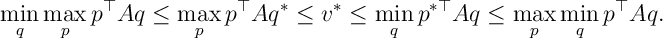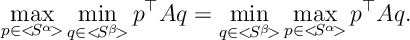 A maximin criterion is somewhat pessimistic; an opponent need not choose the strategy that gives the worst outcome. This said, one setting where it is in an player’s interest to take its opponents reward is a zero-sum game. Even so, it may still be the case that a player and his opponent choose maximin pure strategies but the opponents choice gives a reward above that anticipated by the players pessimistic maximin strategy. If we now allow players to choose mixed strategies, we see in following theorem that this is no longer the case and the player was correct to be pessimistic.