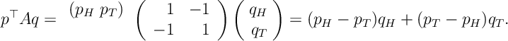 Clearly, no pure strategy equilibrium can exist e.g. if the first player always chooses heads then the second always chooses tails and so it is in the first player’s advantage to play tails more. By this same logic, intuitively, no player would want to bias towards heads or tails as their opponent could exploit this. Thus one might expect the solution to be a mixed strategy playing head and tails with equal probability and thus the expected value is zero. Let’s validate this.