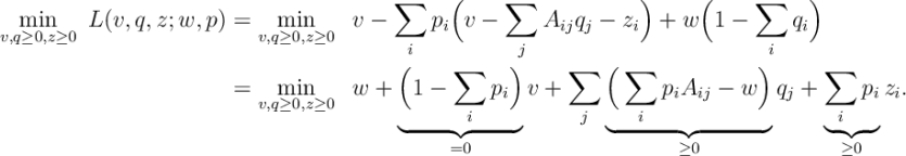 Let’s calculate the dual of this linear program. Minimizing its Lagrangian gives