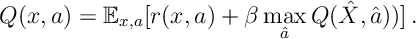 ![\label{QL:FixedPoint} Q(x,a) = \mathbb E_{x,a} [ r(x,a) + \beta \max_{\hat{a}} Q(\hat{X},\hat{a}) )]\, .](https://appliedprobability.blog/wp-content/uploads/2019/01/3333f304cfcf0b908278f2feec330a54.png?w=840)