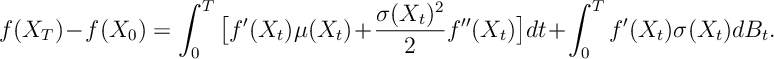 ![f(X_T)-f(X_0) = \int_{0}^{T}\big[ f'(X_t) \mu(X_t) + \frac{\sigma(X_t)^2}{2}f''(X_t) \big]dt + \int_0^T f'(X_t) \sigma(X_t) dB_t.](https://appliedprobability.blog/wp-content/uploads/2019/01/065cbf38206d48e7d12fc24102554250.png?w=840)