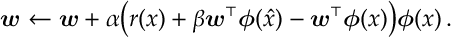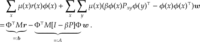 ![\begin{aligned} &\sum_x \mu(x) r(x) \bm\phi(x) + \sum _x \sum_y \mu(x) ( \beta \bm \phi(x) P_{xy} \bm \phi(y)^\top -\bm \phi(x) \bm \phi(x)^\top )\bm w \\ = & \underbrace{\Phi^\top M \bm r }_{=: \bm b} - \underbrace{ \Phi^\top M [I-\beta P] \Phi }_{=: A}\bm w\, .\end{aligned}](https://appliedprobability.blog/wp-content/uploads/2019/04/0d986a70dd4e78e0426226d3f0700a4c.png?w=840)