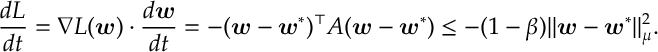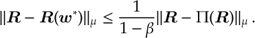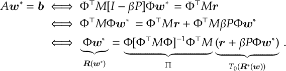 ![\begin{aligned} A \bm w^* = \bm b & \iff \Phi^\top M [I-\beta P] \Phi \bm w^*\, = {\Phi^\top M \bm r } \\ & \iff \Phi^\top M \Phi \bm w^*\, = {\Phi^\top M \bm r } + \Phi^\top M \beta P \Phi \bm w^* \\ & \iff \underbrace{ \Phi \bm w^* }_{ \bm R(\bm w^*) } = \underbrace{ \Phi [\Phi^\top M \Phi ]^{-1} {\Phi^\top M } }_{ \Pi } \underbrace{ (\bm r + \beta P \Phi \bm w^*) }_{ T_0(\bm R^*(\bm w)) }\, .\end{aligned}](https://appliedprobability.blog/wp-content/uploads/2019/04/a9eb4578a8ca51a7569bfa217f43aaa7.png?w=840)