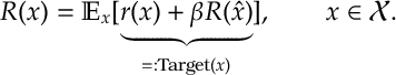 ![R(x) = \mathbb E_x [ \underbrace{ r(x) + \beta R(\hat{x}) }_{ =:\text{Target}(x) }],\qquad x\in \mathcal X. \label{TD:REqn}](https://appliedprobability.blog/wp-content/uploads/2019/04/f37eafd74f72c0026ae309ff66e9fef4.png?w=840)