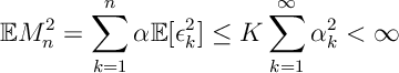 ![\mathbb E M_n^2 = \sum_{k=1}^n \alpha \mathbb E [ \epsilon_k^2] \leq K\sum_{k=1}^\infty \alpha_k^2 <\infty](https://appliedprobability.blog/wp-content/uploads/2020/02/dcc52b7daa5c7b61b5513c43d37e567f.png?w=840)