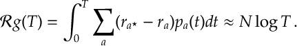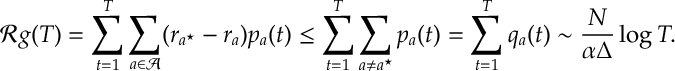 Here we let be the reward of the optimal arm [Note this term does not play a role the dynamics of our model but will be useful for analyzing regret.] The regret of the algorithm is defined to be