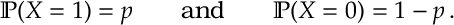 \mathbb E [ X] = p , \qquad \text{and} \qquad \mathbb V(X) = p(1-p) \,.