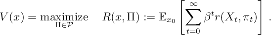 ![V(x) = \maxi_{\Pi \in {\mathcal P} } \quad R(x,\Pi) := \mathbb{E}_{x_0} \left[ \sum_{t=0}^{\infty} \beta^{t} r(X_t,\pi_t) \right] \, .](https://appliedprobability.blog/wp-content/uploads/2019/01/c0c1e66eb9b0cb64c2860e22d53a5d16.png?w=840)